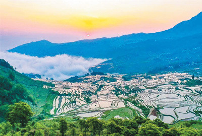 凛冽的晨风带着丝丝清甜,宛如灵动的仙子轻轻拂过,梯田中的水面泛起粼粼波光。这些水,汇聚着雨水、雪水与山泉水,仿若山间的精灵在微光下幻化成一面面魔镜。微风拂过,水面的粼粼波光似画笔肆意地涂抹、晕染着倒映的云霞,橙紫交织处像是梦幻的水母在光影的深海中游弋,将那紫、粉、橙三色交融的绮丽成倍放大,像童话世界里通往神秘城堡的入口。
